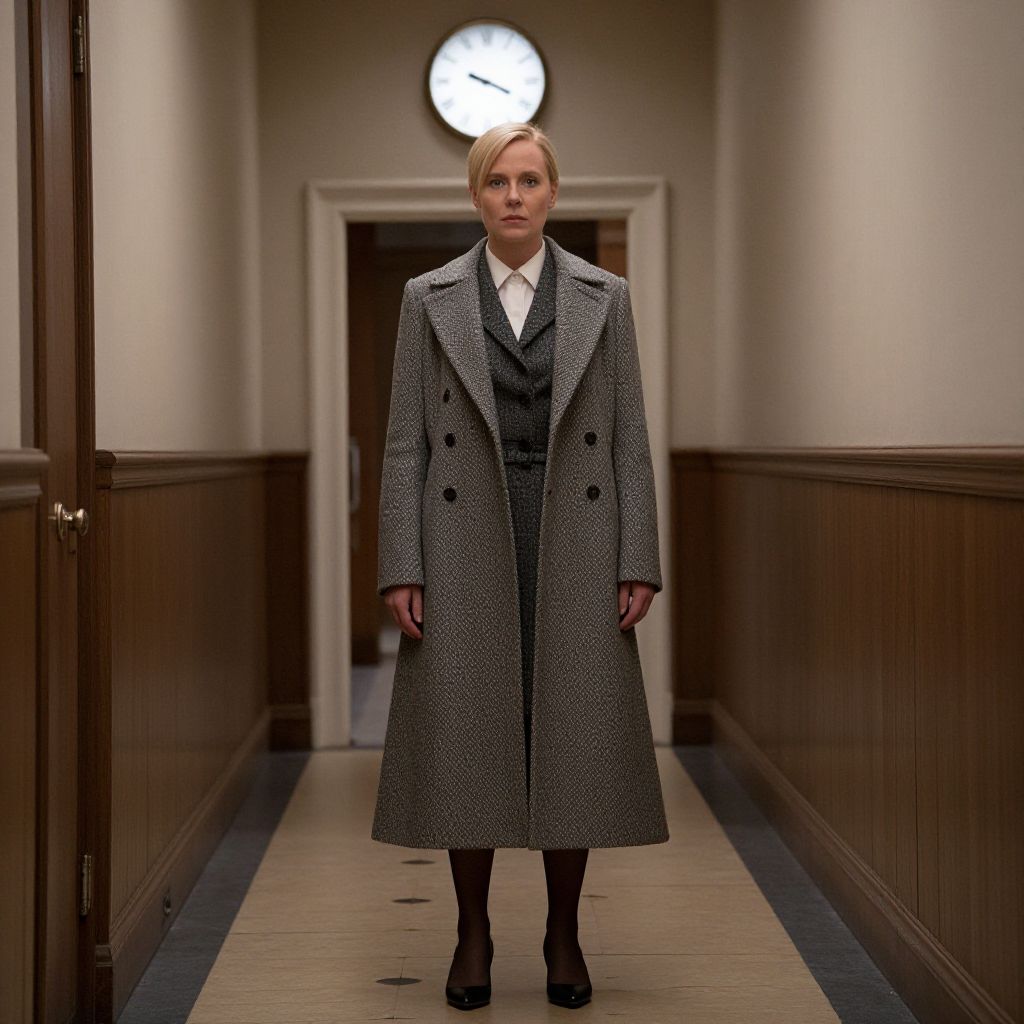 Photograph of a serious-looking blonde woman standing in a narrow, dimly lit hallway with wooden wainscoting. She wears a long, black and grey herringbone coat over a black vest and white shirt, paired with a black tie. She also wears black tights and black shoes. Her hair is neatly pulled back. The hallway has a white clock centered on the far wall, with a wooden door on either side. The floor is tiled in beige and dark blue. The image has a dramatic, almost cinematic quality.