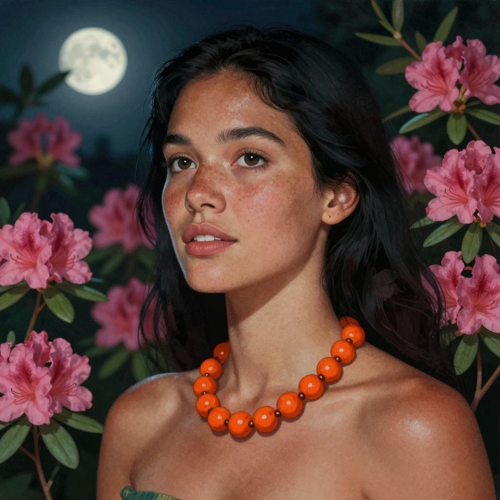 Portrait, stylized, close up of a Tasteless Hesitant voluptuous South African (Melia:1.3) Safari Guide, she is from the 1900's, she is feeling very grateful, she has Indonesian hair, Melia has a Colorful Reiwa Era dark orange Body Chain, Freckles, from inside of a Young Saint Helena, dense foliage with Azalea, Moon in the night, shallow depth of field, (art by Loish:0.9), (John Constable:1.0), (Beatrix Potter:1.1), Sketch, Peaceful, Vorticism Art, moody lighting, F/5, Film Washi, otherworldly, bloom, realistic attractive face, detailed skin, extremely beautiful, 8K