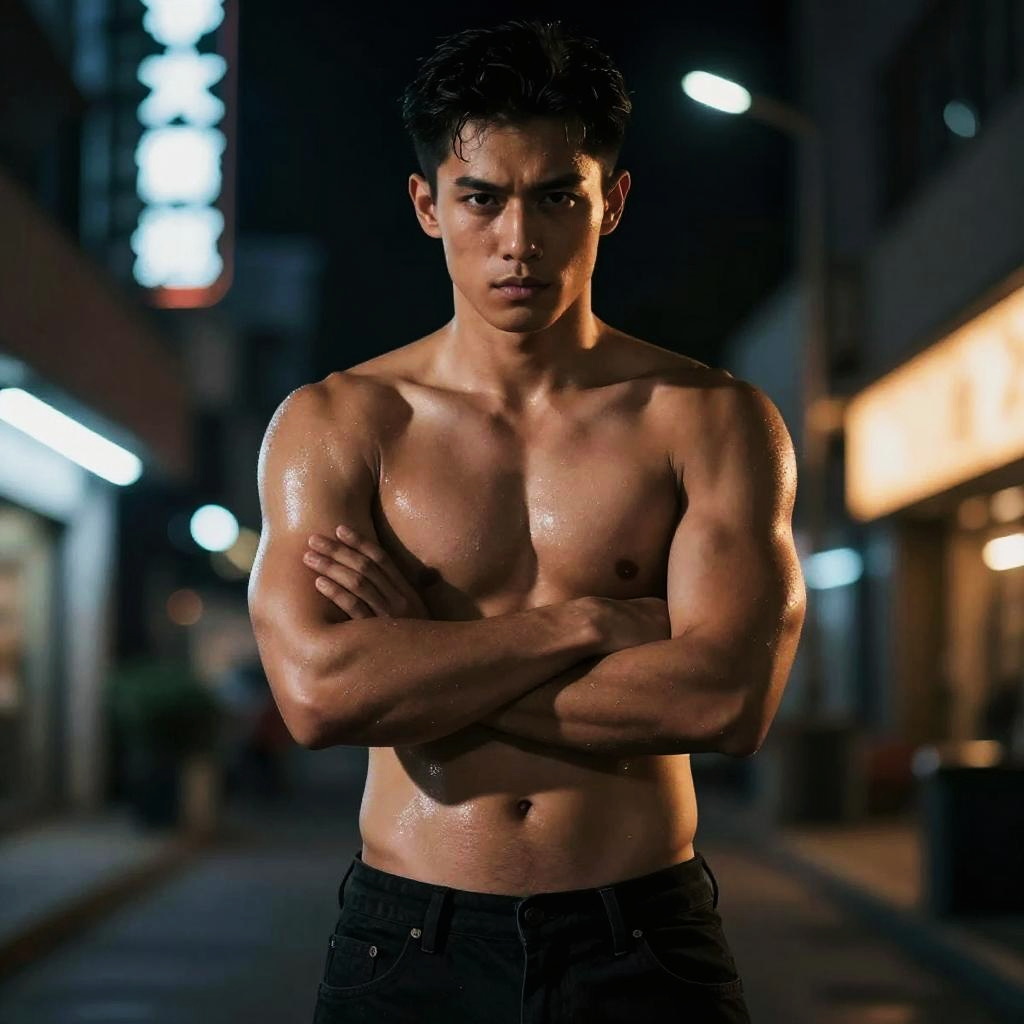 Photograph of a muscular, shirtless Asian man with wet, glistening skin standing in a dimly lit, narrow urban alley at night. His dark hair is damp and slicked back, and he has a stern, focused expression. His arms are crossed over his chest, highlighting his defined biceps and pectorals. He wears black pants, and the background features blurred, brightly lit storefronts with neon signs, creating a contrast with the dark alley. The lighting emphasizes his muscular physique and the sheen of sweat on his skin.