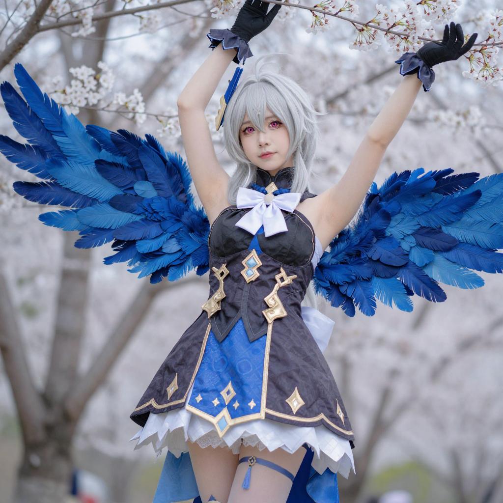 Photograph of a cosplayer with silver hair, pink eyes, and pale skin, wearing a black and blue fantasy dress with gold accents, white bow, and blue skirt. She has blue feathered wings and is posing with arms raised, surrounded by white cherry blossoms in the background.