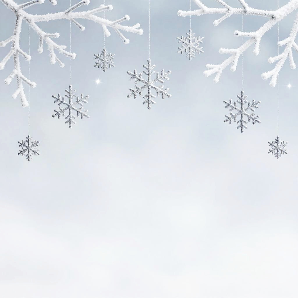 Fondo navideño para fotos, an elegant minimalistic design with frosted white branches, silver snowflakes hanging delicately, soft blue and white light creating a serene winter wonderland effect, perfect for stylish and simple Christmas portraits.