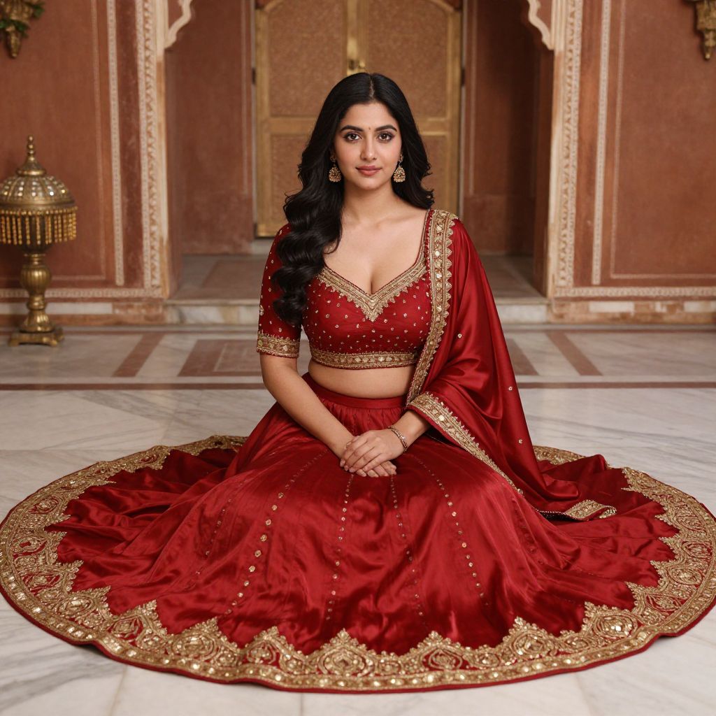 A graceful Indian woman with long black hair, fair complexion, and soft round eyes in a full lehenga churidar made of rich crimson silk with intricate gold border details, seated on a marble floor of a palace in Jaipur, surrounded by traditional decor and soft lighting.. The woman has big tits and cute face
