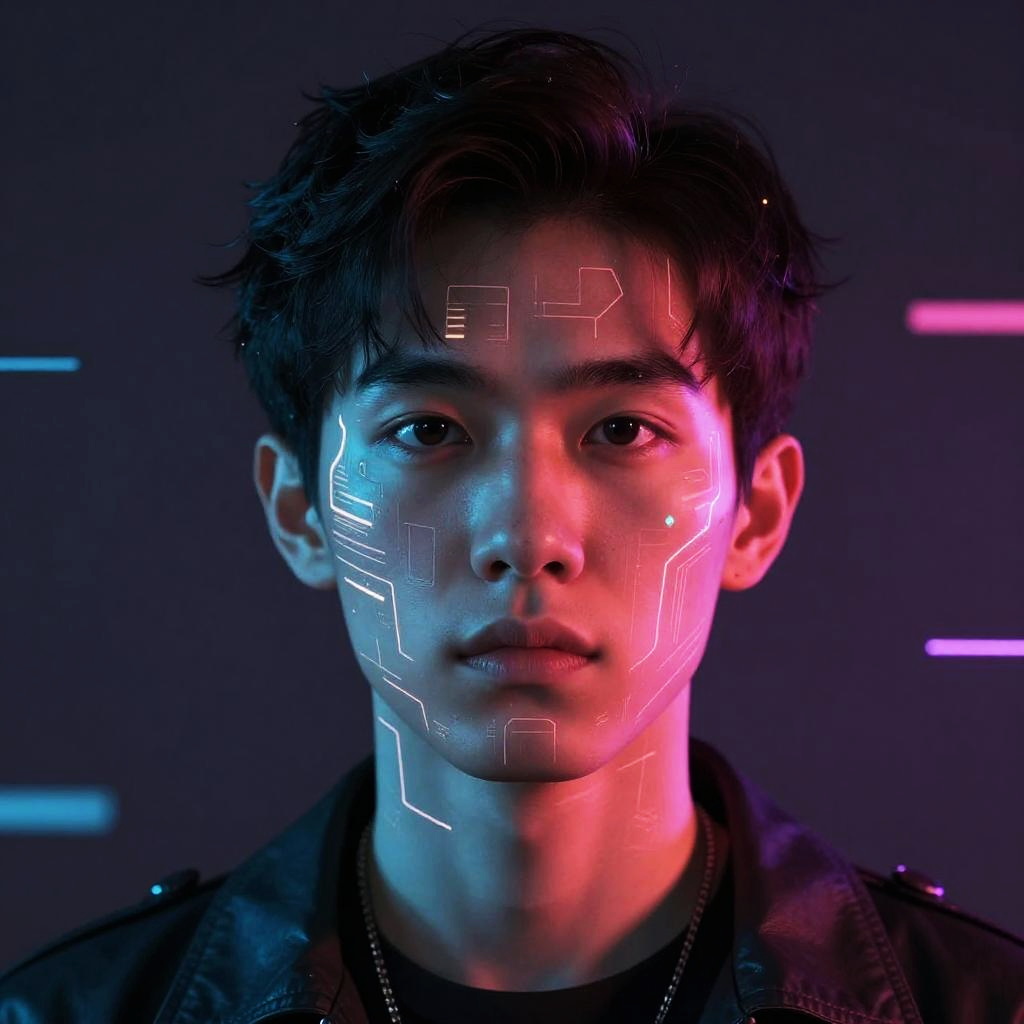 Make AI art from photo, turning a portrait of a person into a stunning cyberpunk artwork with glowing lines, geometric patterns, and intense color contrasts, capturing emotion and depth with a blend of realism and digital abstraction