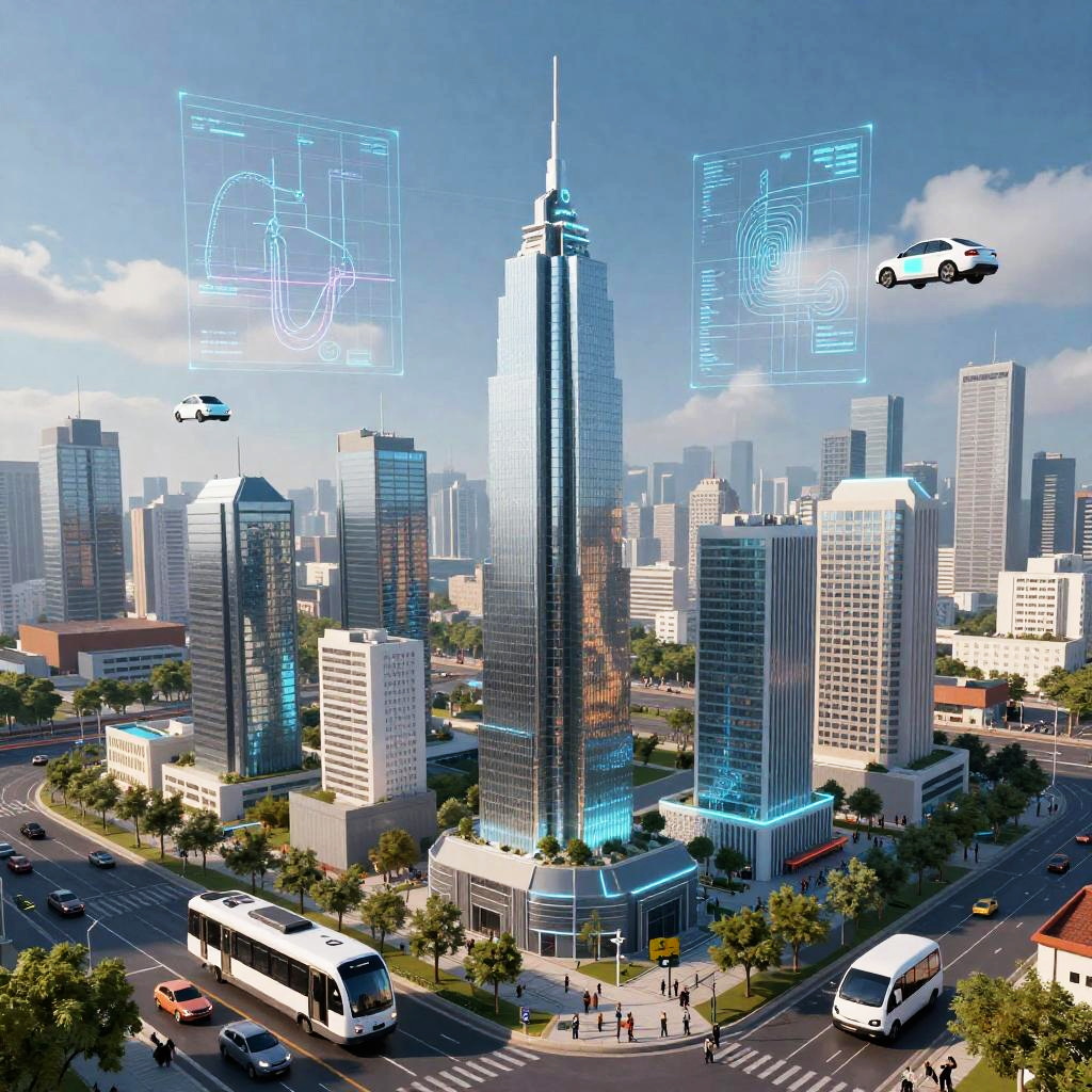 Futuristic scene showing an AI building generator holographic projection crafting diverse urban structures in real-time, with digital grids and algorithm visualizations hovering above a bustling cityscape filled with autonomous public transport and flying cars.