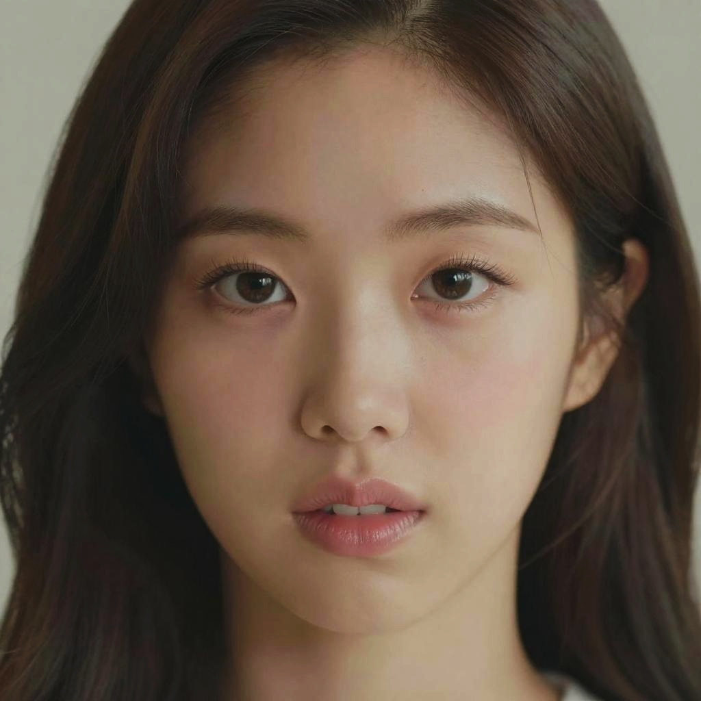 Close-up photograph of an East Asian woman with straight, dark brown hair, fair skin, and natural makeup, gazing directly at the camera with a