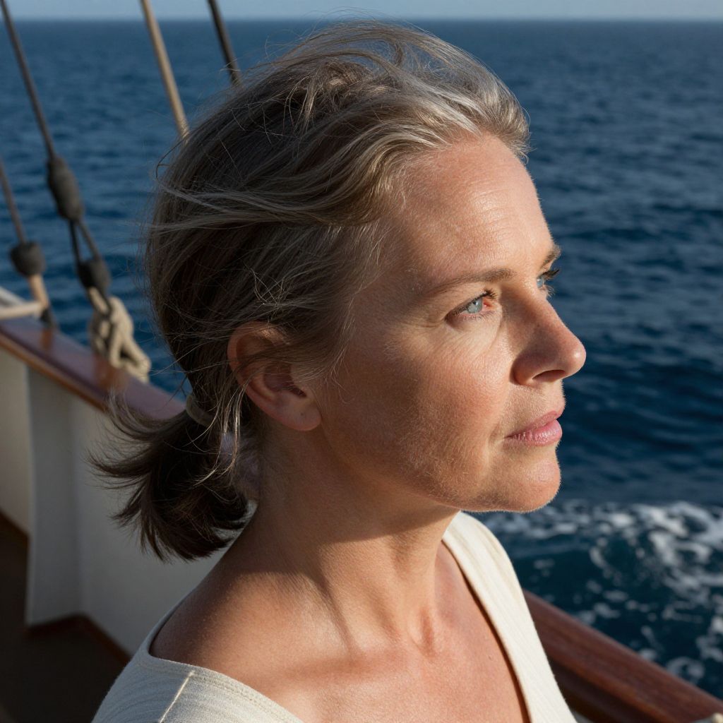 Photograph of a middle-aged Caucasian woman with short, wavy gray hair, standing on a boat. She has fair skin, blue eyes, and is wearing a white, sleeveless top. Her profile is shown in a side view, gazing at the deep blue ocean, which fills the background. The boat's wooden railing and ropes are visible on the left. The sunlight creates a bright, clear contrast, highlighting her face and the calm sea. The texture of her hair and the smoothness of her skin are clearly visible.