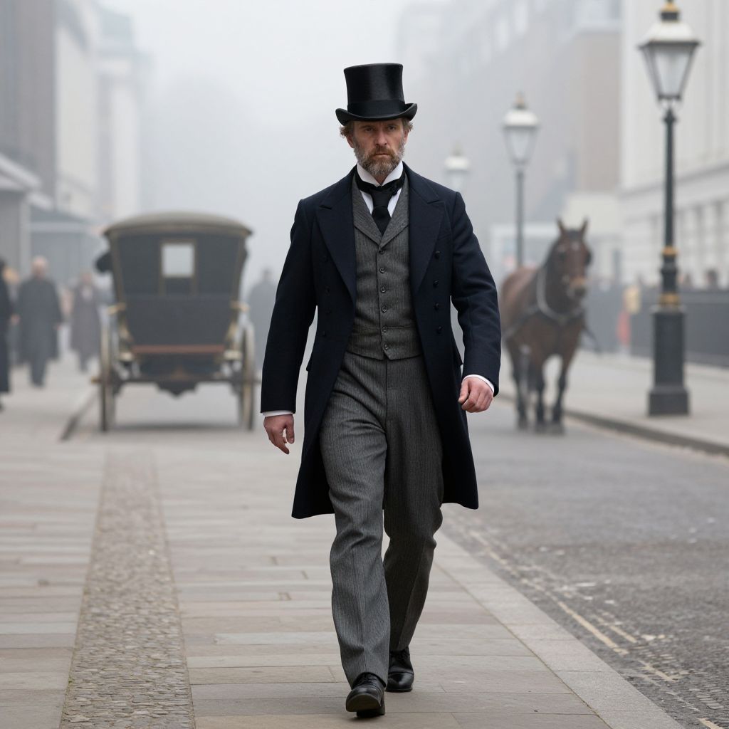 A tall man in his 30s with weathered beard and stern facial features dressed in a Victorian-era British gentleman's outfit—tailored waistcoat, top hat, and frock coat—walking through a foggy London street in 1885, with horse-drawn carriages and gas lamps in the background.
