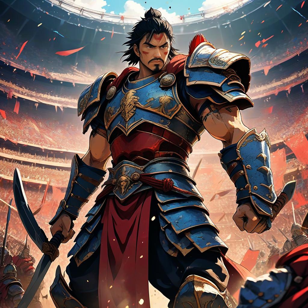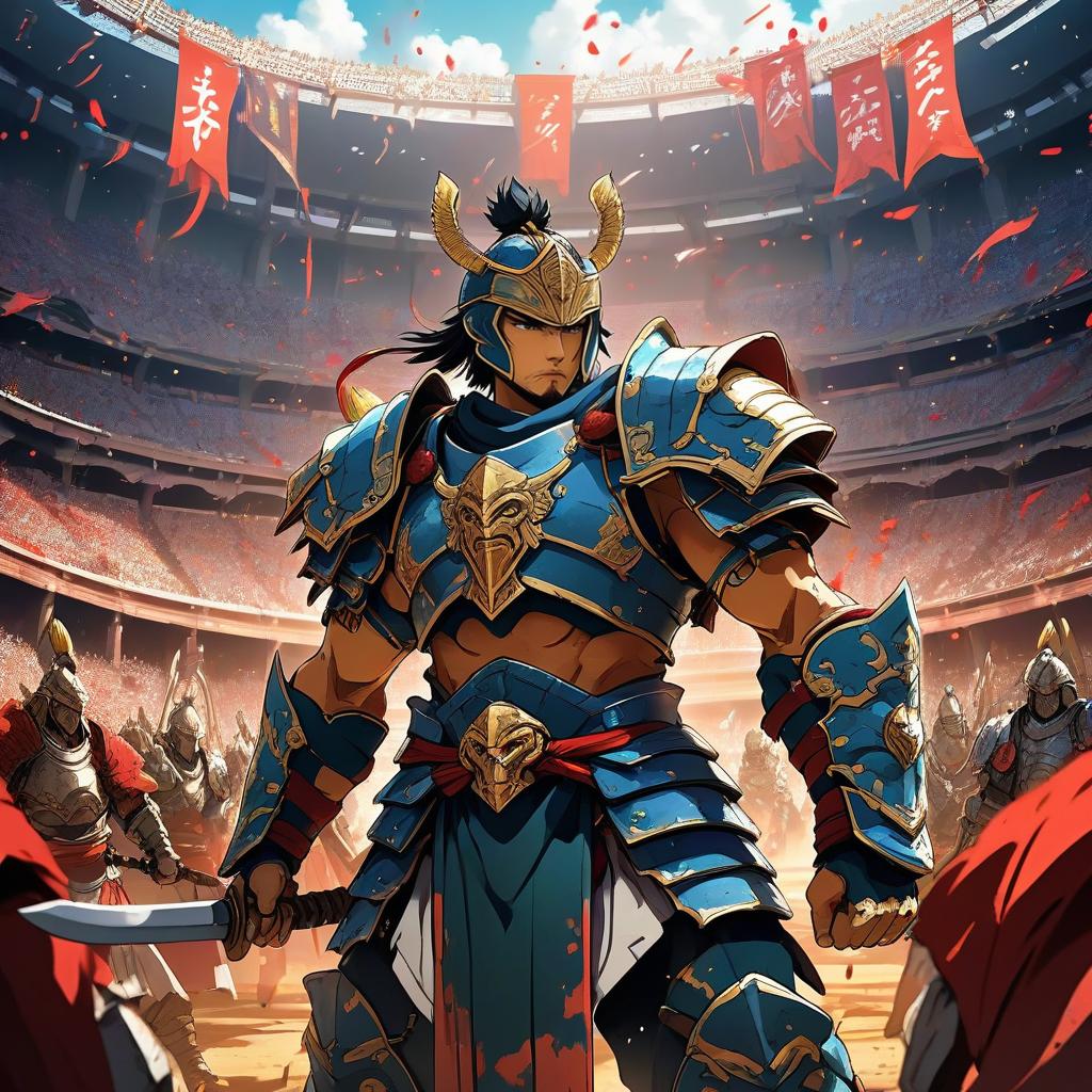 Anime-style illustration of fierce gladiators with battle scars and unique colorful armor, standing in formation inside a vast grand arena filled with thousands of animated spectators. The scene captures determination and strength with characters holding swords, set under a bright sky.