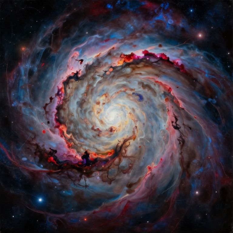 Craft an image in the style of a dynamic oil painting, capturing the essence of creation and destruction within a cosmic nebula's swirling vortex. This vivid, abstract representation showcases bold brushstrokes evoking movement and energy, radiating from the nebula's heart while an intricate celestial backdrop stretches into the night sky. Depict this otherworldly scene from a unique perspective, as if viewed by a cosmic observer floating amidst the celestial expanse, inviting contemplation of existence's beauty and chaos in this mesmerizing visual symphony.