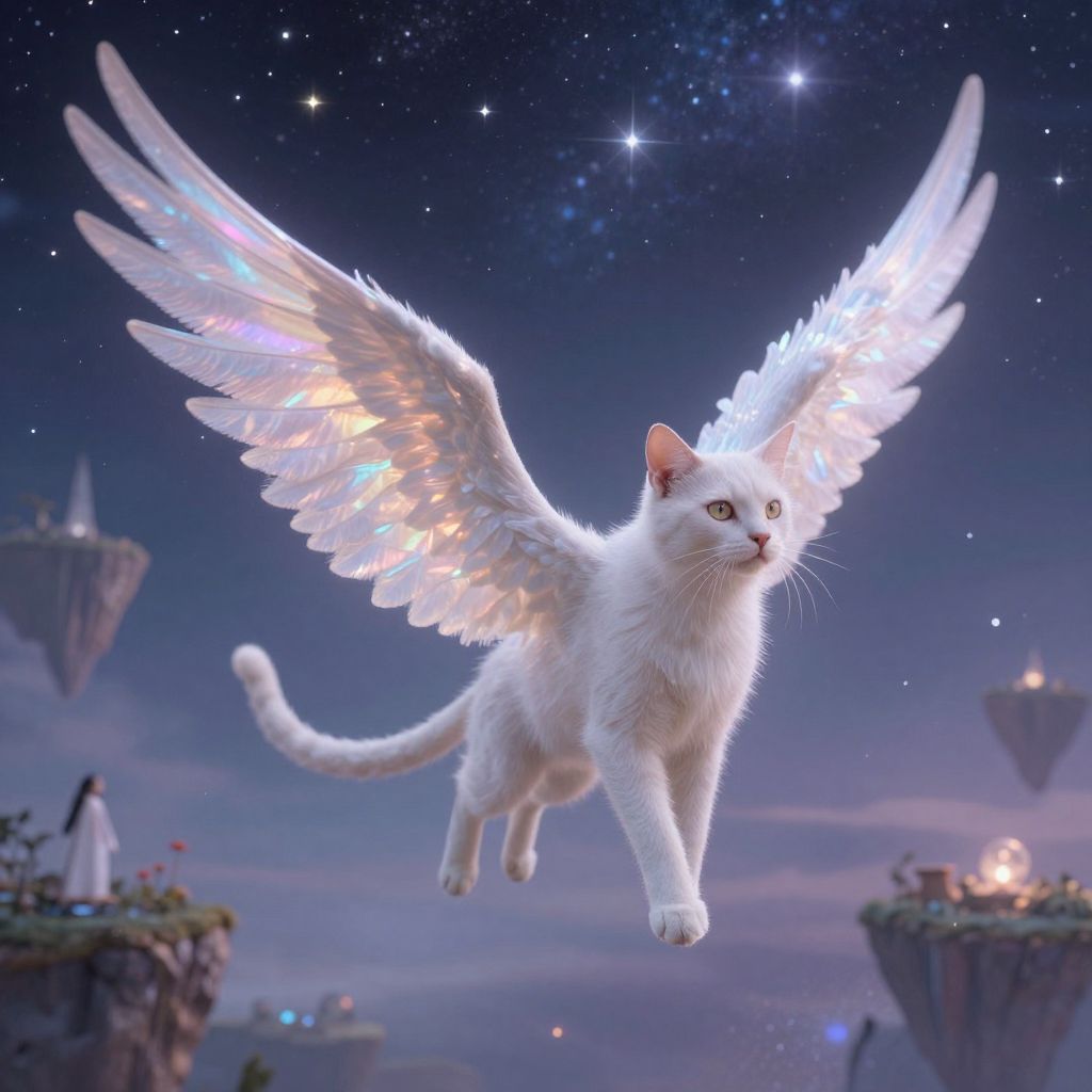 Digital art of a white cat with glowing angel wings soaring in a starry night sky, surrounded by floating islands.