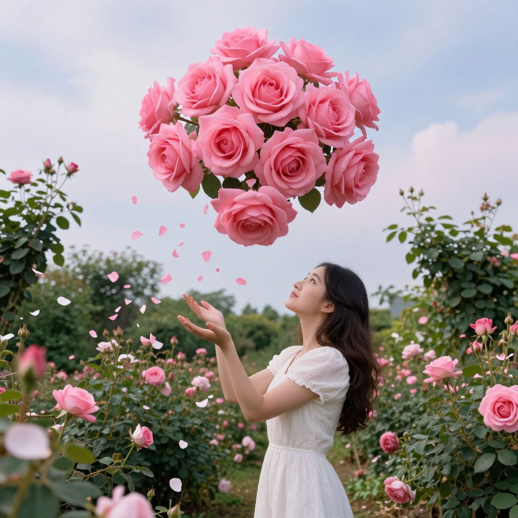 A young woman stands amidst a vibrant garden, her hands outstretched as she gazes upward toward a cluster of oversized, luminous pink roses that float gracefully above her, surrounded by cascading rose petals and lush green foliage under a serene, cloud-dotted sky.