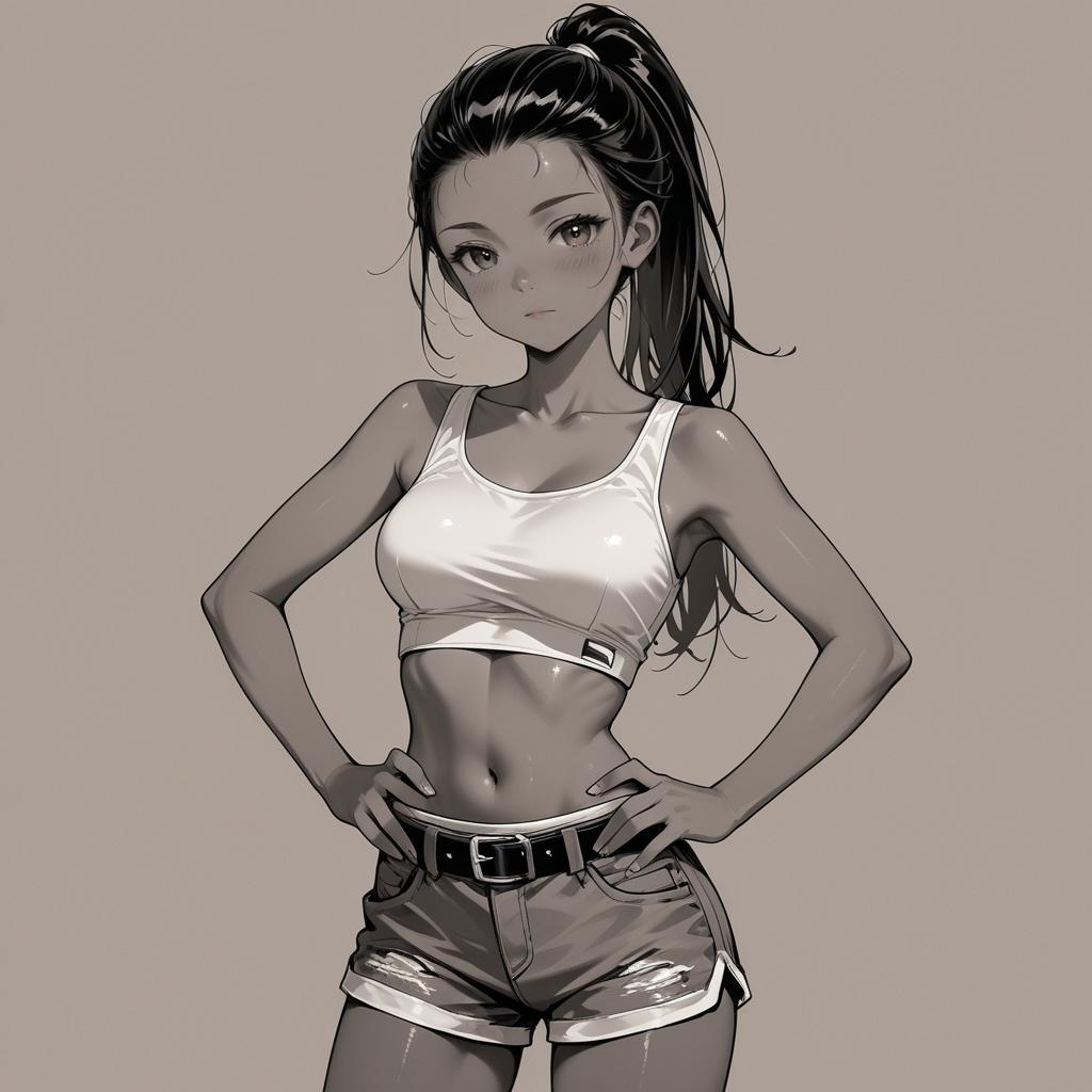 Monochrome digital illustration of a dark-skinned young woman with long black hair tied in a ponytail. She is wearing a white sports bra crop top, short denim shorts with a black belt, and has her hands on her hips. The figure is depicted from mid-thigh up, standing confidently against a plain background.