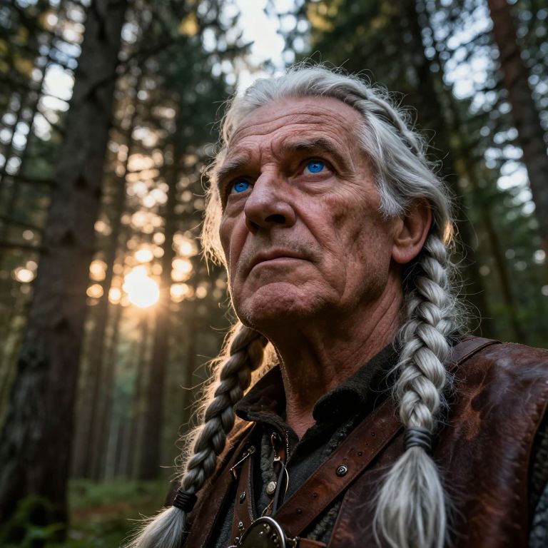 Craft a portrait of an aged Slavic adventurer with piercing blue eyes and weathered skin, bathed in the warm glow of sunset rays filtering through a dense forest canopy. Their intense gaze, reflecting both resolve and contemplation, captures their surroundings from an unconventional low-angle perspective. The intricate details, such as silver braided hair and rugged leather attire, add depth to this evocative image that embodies wanderlust's essence and resilience.
