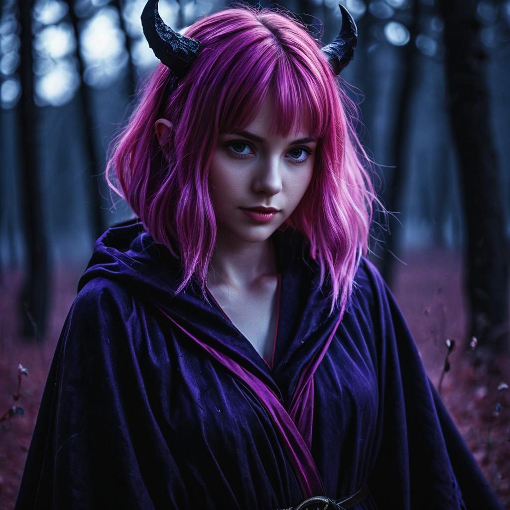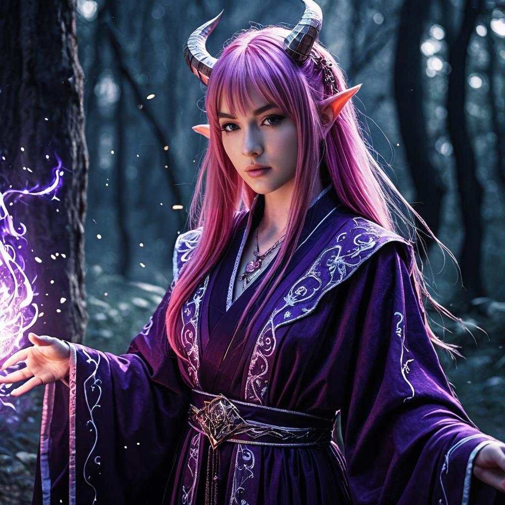 Fantasy portrait of a young woman with long pink hair, devil-like horns, and pointed elf ears. She is dressed in a flowing purple robe adorned with intricate silver embroidery, standing in a mystical forest setting. The scene features glowing magical effects emanating from her hand, rendered in ultra-high detail anime style.