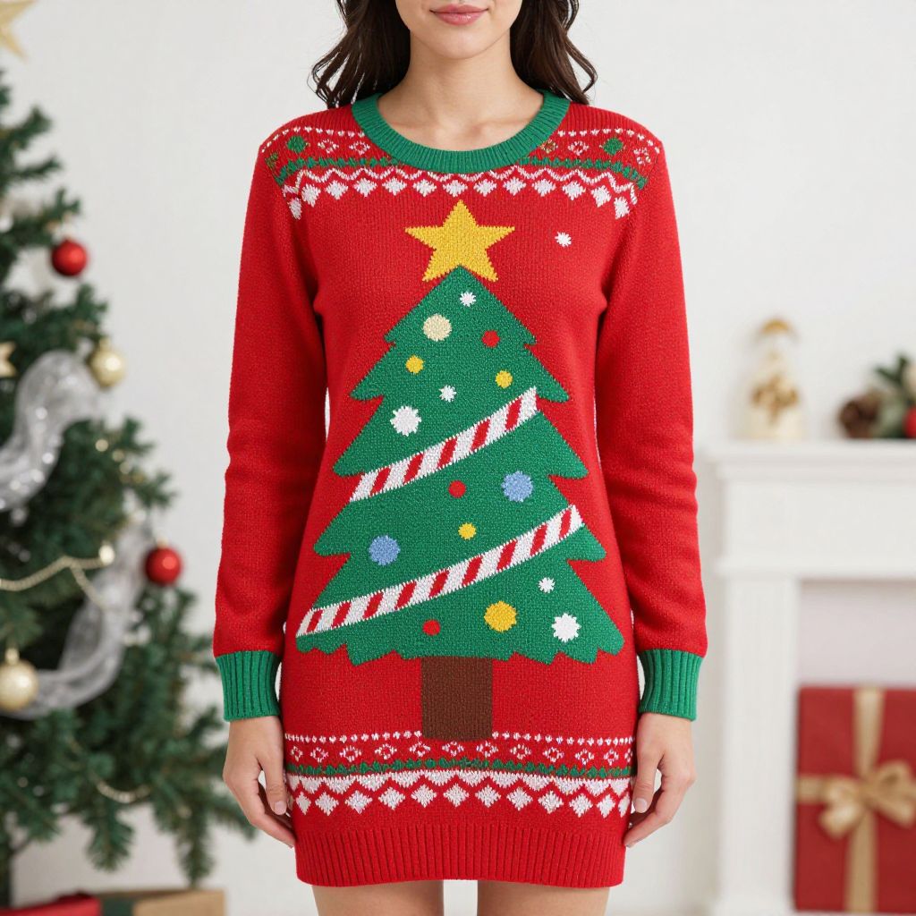 Close-up of a woman wearing a red and green Christmas sweater dress featuring a large decorated Christmas tree design with candy cane stripes, colorful polka dots, and a yellow star on top. The sweater dress has green cuffs and neckline, ideal for holiday celebrations. Background includes a decorated Christmas tree and wrapped gifts.