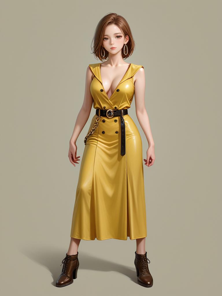 1girl, realistic face, full body shot, Woman, casual chic, spaghetti strap skater dress in earthy mustard hue, square neckline, fitted bodice, flared skirt above the knee, minimal silver choker necklace, no visible footwear, plain white background.