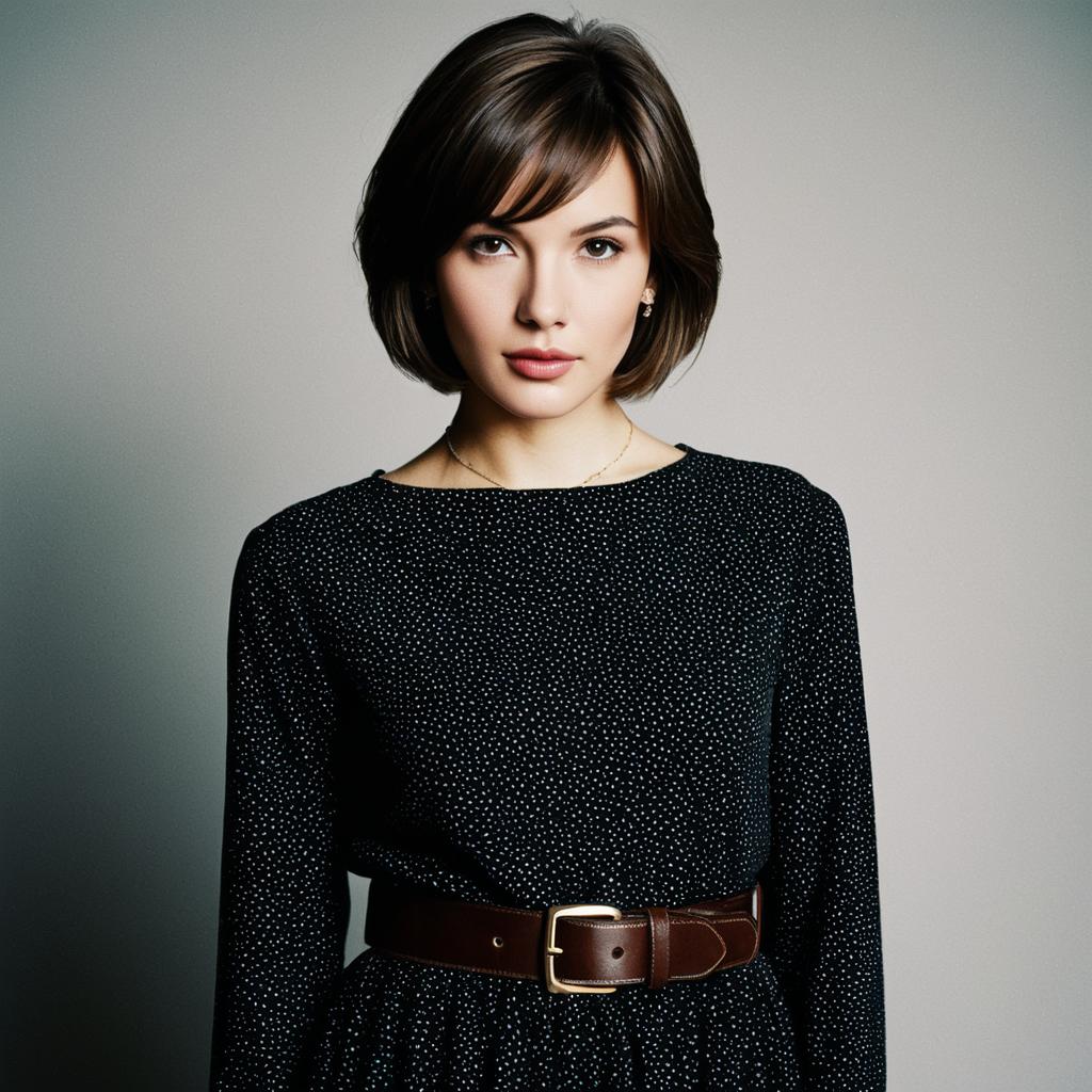 Portrait of a young woman with brown hair and brown eyes wearing a black floral dress and a multi-colored flower crown. She is surrounded by colorful balloons against a dark background, looking directly at the viewer with a calm expression.