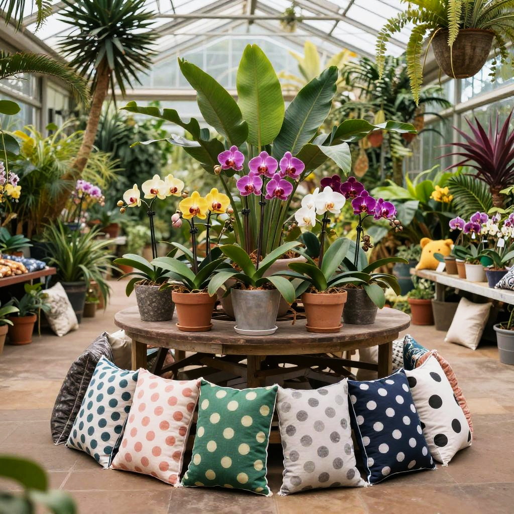 Photograph of a lush greenhouse interior filled with various potted plants, including vibrant orchids with purple, white, and yellow blooms. A wooden table is surrounded by an arrangement of colorful, patterned throw pillows in shades of white, black, and brown with polka dots and stripes. The greenhouse has a glass roof, allowing natural light to illuminate the greenery. The floor is tiled in a rustic brown pattern, and more potted plants are visible in the background, creating a lush, tropical ambiance. The scene is cozy and inviting, blending natural beauty with decorative elements.