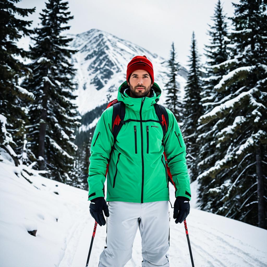 Two people skiing. The man on the left wears a red and blue patterned ski suit, red gloves, and a red hat with blue accents. He holds ski poles and smiles. The woman on the right wears a black, ured ski suit and a grey headband. She holds ski poles and looks to the side. Snow-covered trees and a metal railing are in the background. Sunlight creates shadows on the snow.