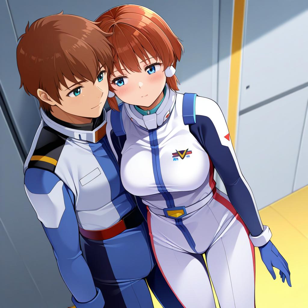 Illustration of a young male anime character with brown short hair and blue eyes wearing a blue pilot suit, featuring white gloves and shoulder armor. The image shows two different angles of the character, one in a focused stance and another with a calm expression, set against a softly lit background.