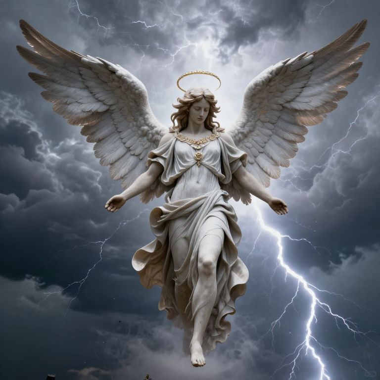 A majestic archangel with outstretched wings, surrounded by a dramatic thunderstorm.
