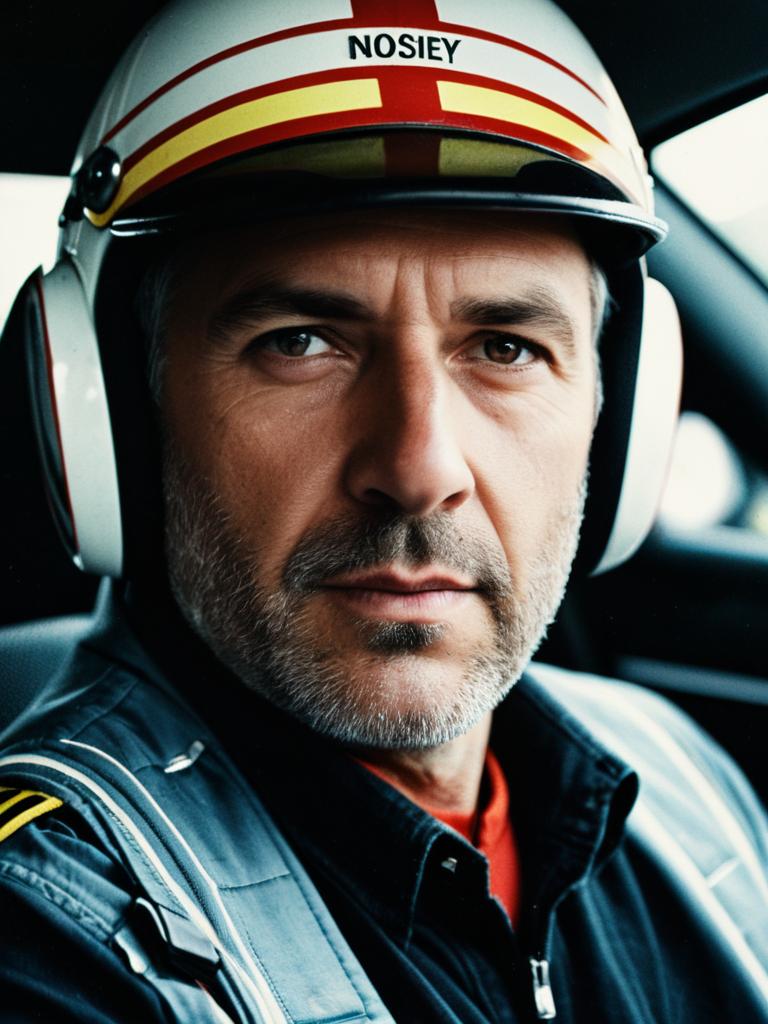 Photorealistic close-up headshot of a man wearing a driver costume, including a black uniform and a cap labeled 'MAN'. The man has a serious expression and is seated inside a vehicle, shown behind the steering wheel.