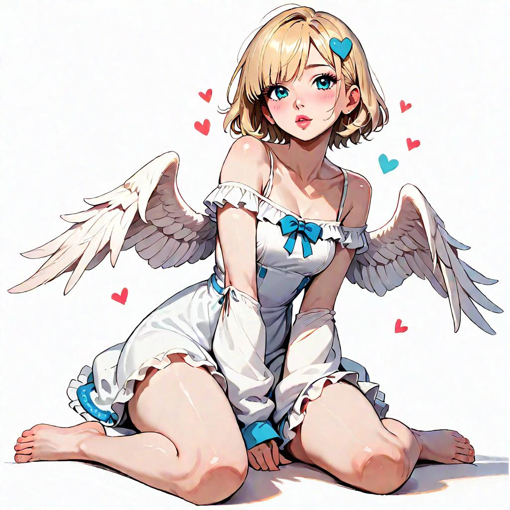 Score_9, score_8_up, score_7_up, score_6_up, score_5_up, score_4_up, masterpiece, best quality, solo, wings, barefoot, blonde hair, short hair, heart hair ornament, sitting, white background, dress, looking at viewer, white wings, white dress, bare shoulders, blush, feathered wings, simple background, full body, hair ornament, blue eyes, heart, angel wings, collarbone, off-shoulder dress, off shoulder, aqua eyes, bangs, between legs, open mouth, knees together feet apart, hand between legs, parted lips, frills