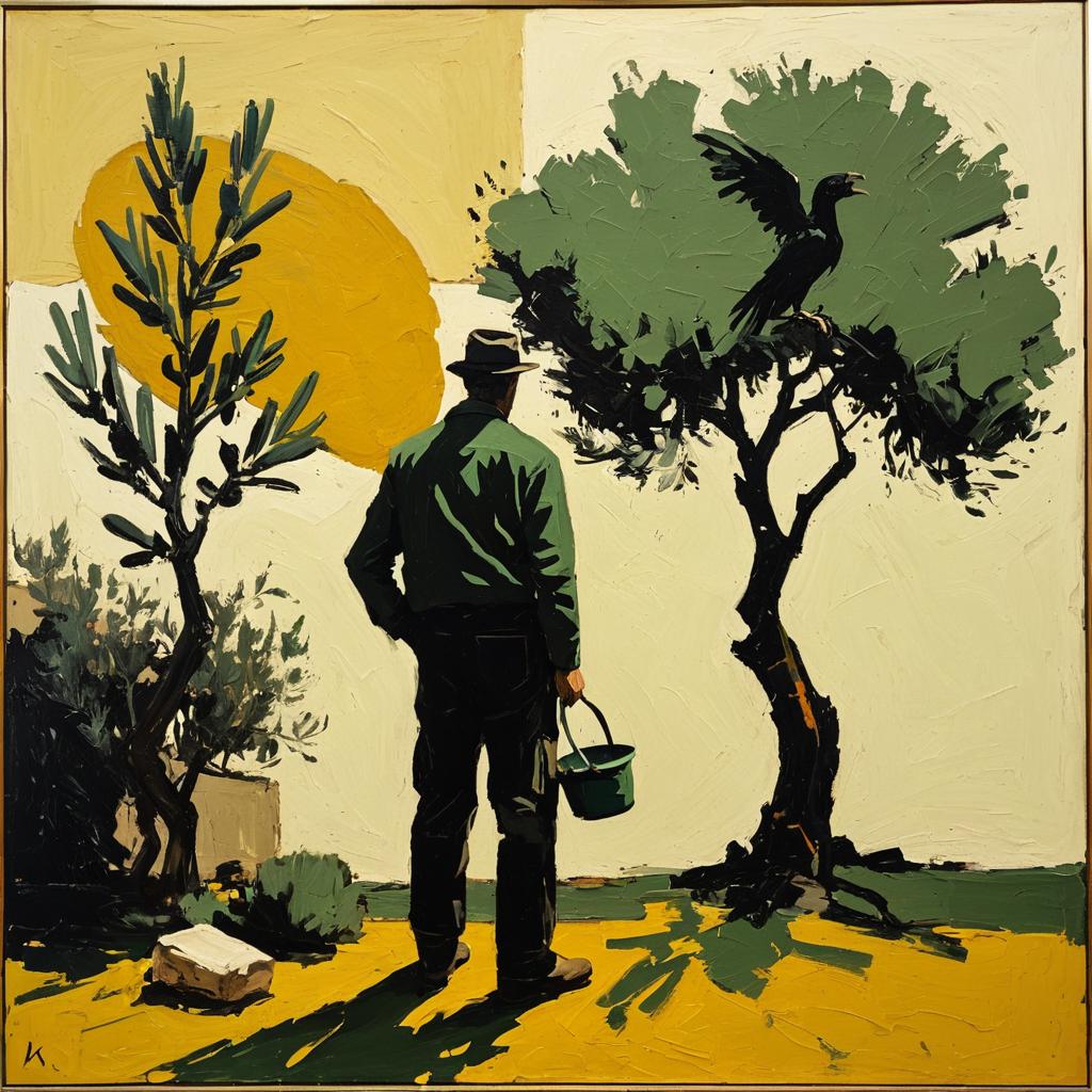Ambient Lighting Abstract minimalistic painting of a gardener and a phoenix by the olive tree, full body, by Franz Kline, rough impasto technique, olive greens with warm amber highlights