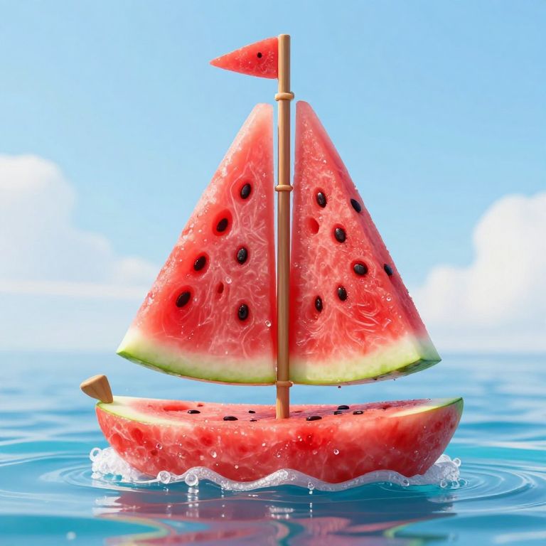 A whimsical watermelon transformed into a sailboat, complete with vibrant red sails and a playful red flag, floats serenely on a painted blue wave, defying gravity and inviting the imagination to embark on a fantastical summer journey.