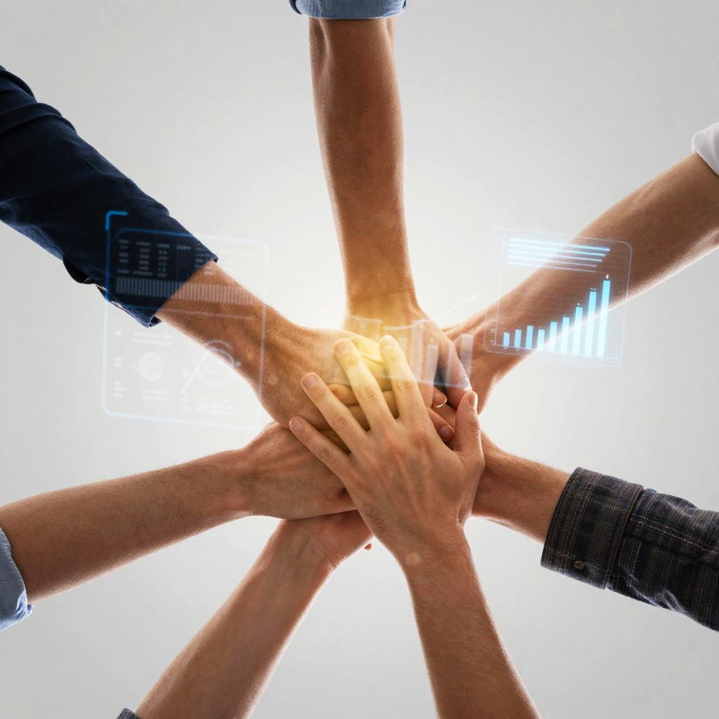 Colaborativos concept showing multiple hands joining in the center symbolizing unity and cooperation, surrounded by holographic charts and graphs, sleek minimalistic background, warm lighting, emphasizing synergy and collective effort in a corporate setting.