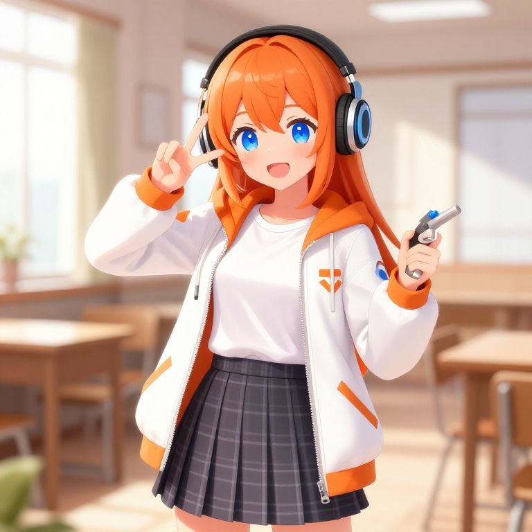 Digital illustration of a cheerful anime girl with orange hair, blue eyes, and wearing headphones. She is dressed in a white jacket with orange accents, a white t-shirt, and a grey plaid skirt. The girl is making a peace sign with one hand and pointing a finger gun with the other inside a brightly lit room with wooden furniture and large windows.