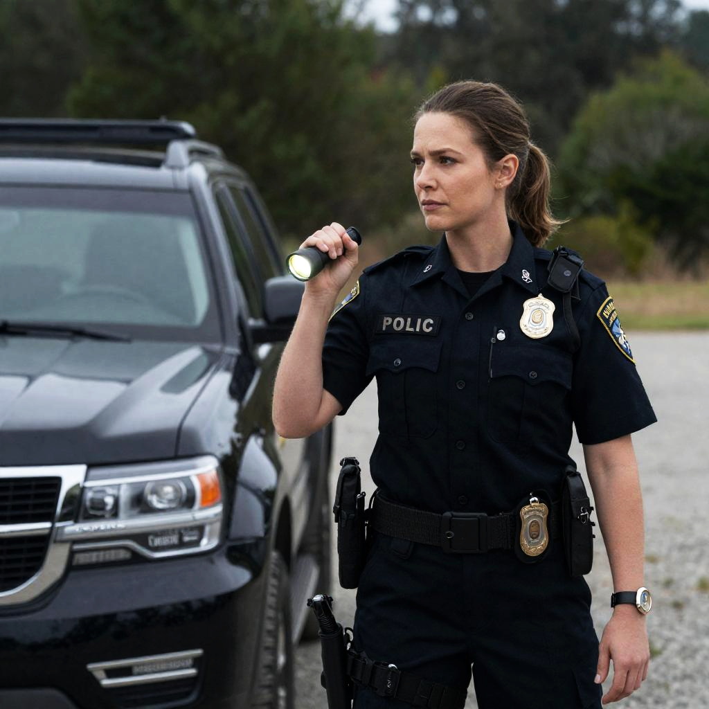 Profile photo of a blonde female police officer wearing a black beret and tactical vest with police emblems. She stands near a police car with a focused expression, while two male officers are blurred in the background in a dim, indoor industrial setting.