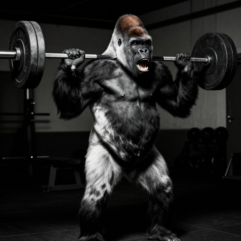 Photograph of a muscular, black-furred gorilla lifting a heavy barbell in a dark, gym-like setting, with dramatic lighting highlighting its powerful