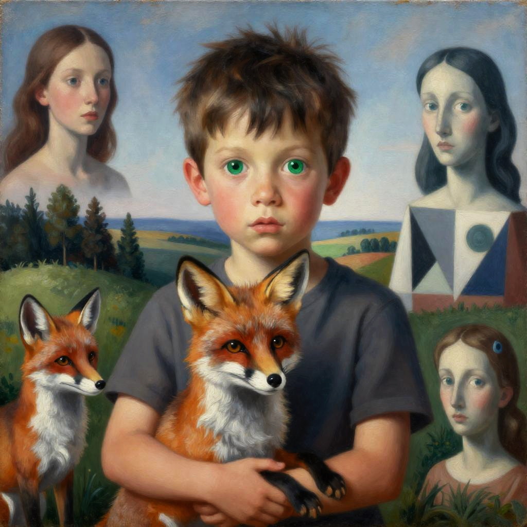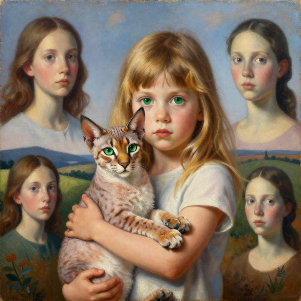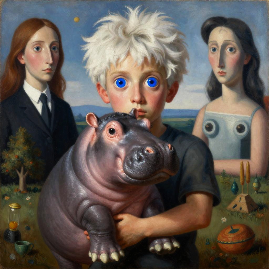 Small woman with big green eyes holds an albino hippopotamus with thick brown hair in her arms, landscape with optical effect, expressive faces, sharp eyes, style trompe d'oeil, oil painting, painter, paintings by masters, museum, paintings and sculptures, visual delirium, dreamlike, style pop surrealism, modern art, vibrant colors, detailed, style Victoria Nahum, style Alexander Jansson, style Picasso, Amazing and beautiful creation, characters and elements of the scenery entirely within the frame of the image, detailed realization, definition high quality, expressive faces, sharp eyes, style trompe d'oeil, surrealism, ambitious aestheticism, varied elements, iconoclast and numerous