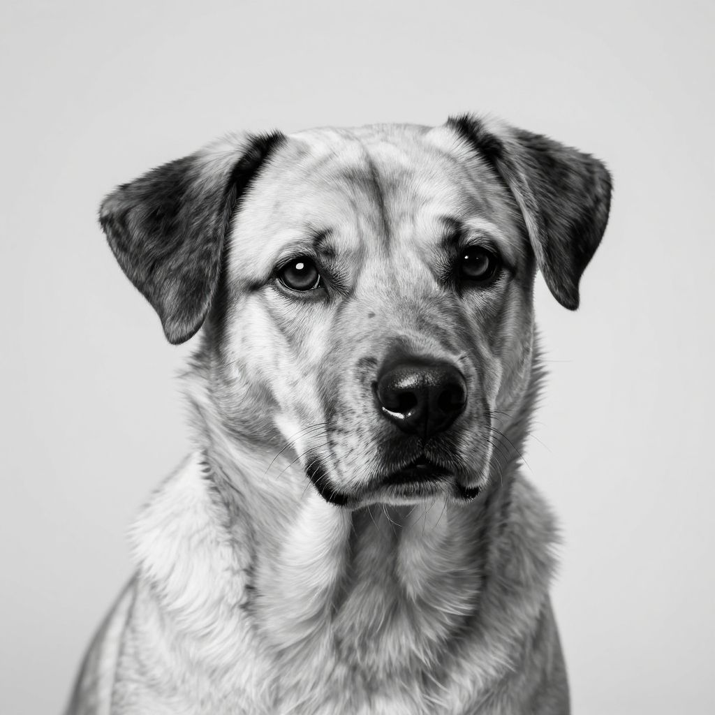 1dog, beautiful, comely, (best quality, masterpiece), monochrome, highres, ultra high res, professional, realistic, hyper-realism, (photorealistic:1.4), vivid detail, absurdres, ultra detailed, extremely detailed, hyper detailed, intricately detailed, fine detail, HDR, UHD, 64K, simple background, natural lighting, Crane Shot, High-Speed Photography
