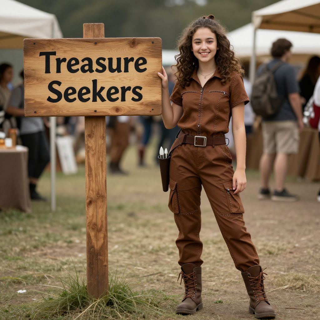 A female teenager with curly brown hair and a cheerful expression dressed in a full brown cargo outfit as a costume for a fantasy festival, standing next to a wooden sign that reads 'Treasure Seekers', the outfit showing visible stitching, sturdy boots, and a belt with hanging tools