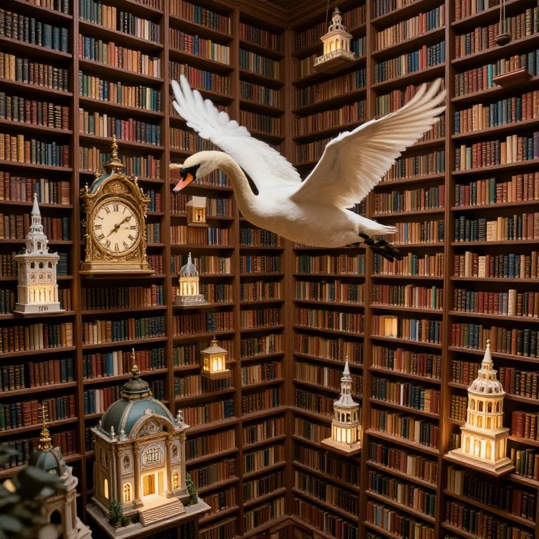 Craft an image depicting a surreal scene where a majestic swan gracefully soars through an expansive library filled with countless rows of towering bookshelves. From the unique vantage point, each book reveals itself to be a meticulously crafted architectural marvel from across the globe, intricately detailed and illuminated as if frozen within their pages. As the swan glides effortlessly between these miniature wonders, it undergoes fluid transformations - momentarily taking the form of an ornate clock face before seamlessly shifting back to its avian shape. The interplay of shapes, sizes, and perspectives creates a dreamlike atmosphere that defies our perception of reality, beckoning viewers on a whimsical exploration through the imaginative fusion of nature, architecture, and literature.