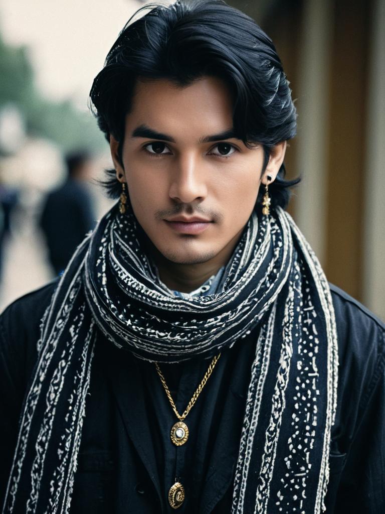 Fashion scarves costume, solo, 1boy, male focus, blurry, black hair, blurry background, scarf, looking at viewer, earrings, realistic, jewelry, black eyes, shirt, upper body, bag