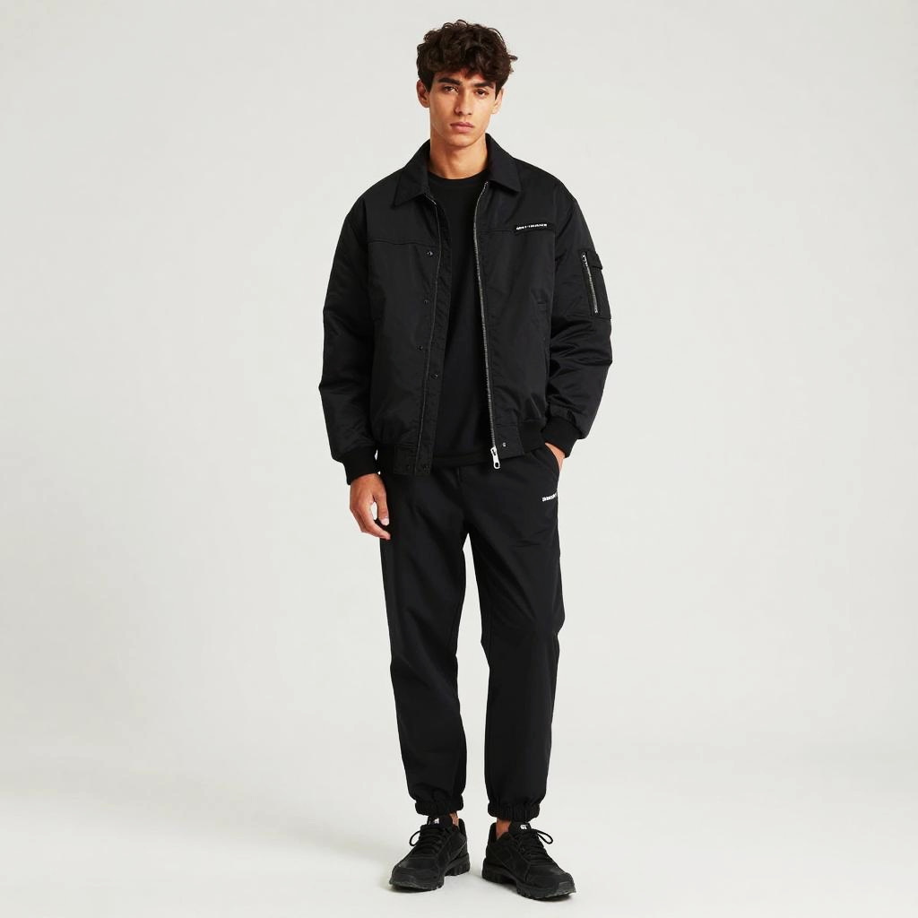 This image features a young man dressed in a stylish all-black streetwear outfit, showcasing a modern urban aesthetic. The minimalist background highlights his confident stance, making the outfit the focal point of the composition.