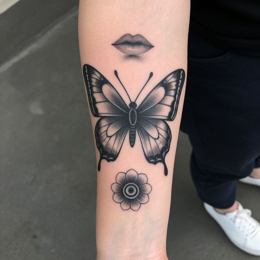 Black tattoo of a butterfly above a flower with a detailed center, and a shaded face with lips on a forearm. Background: dark floor, white shoe