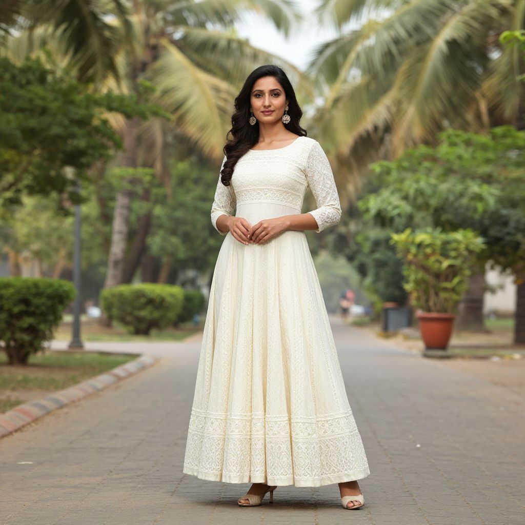 Elegant woman wearing a cream lace Anarkali dress stands gracefully along a tree-lined pathway in Surat, surrounded by lush greenery and palm trees.