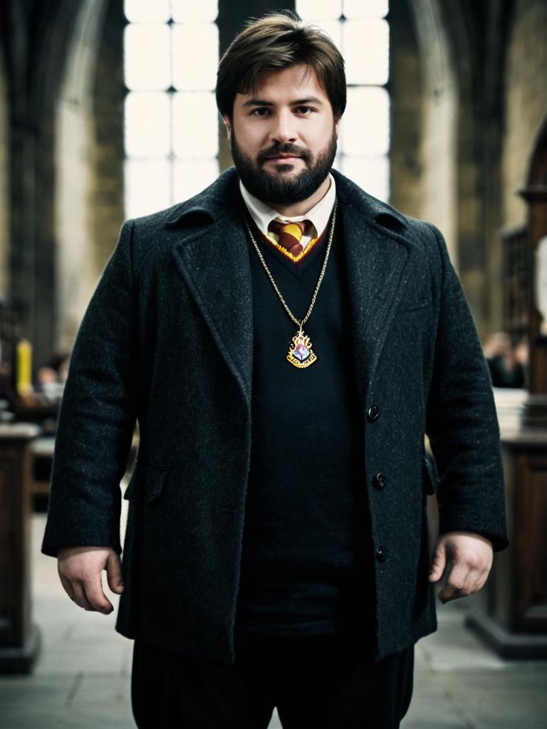 Plus size man harry potter, 1boy, male focus, solo, facial hair, beard, blurry background, looking at viewer, black pants, jewelry, blurry, necklace, coat, standing, realistic, pants, shirt, mustache, long sleeves