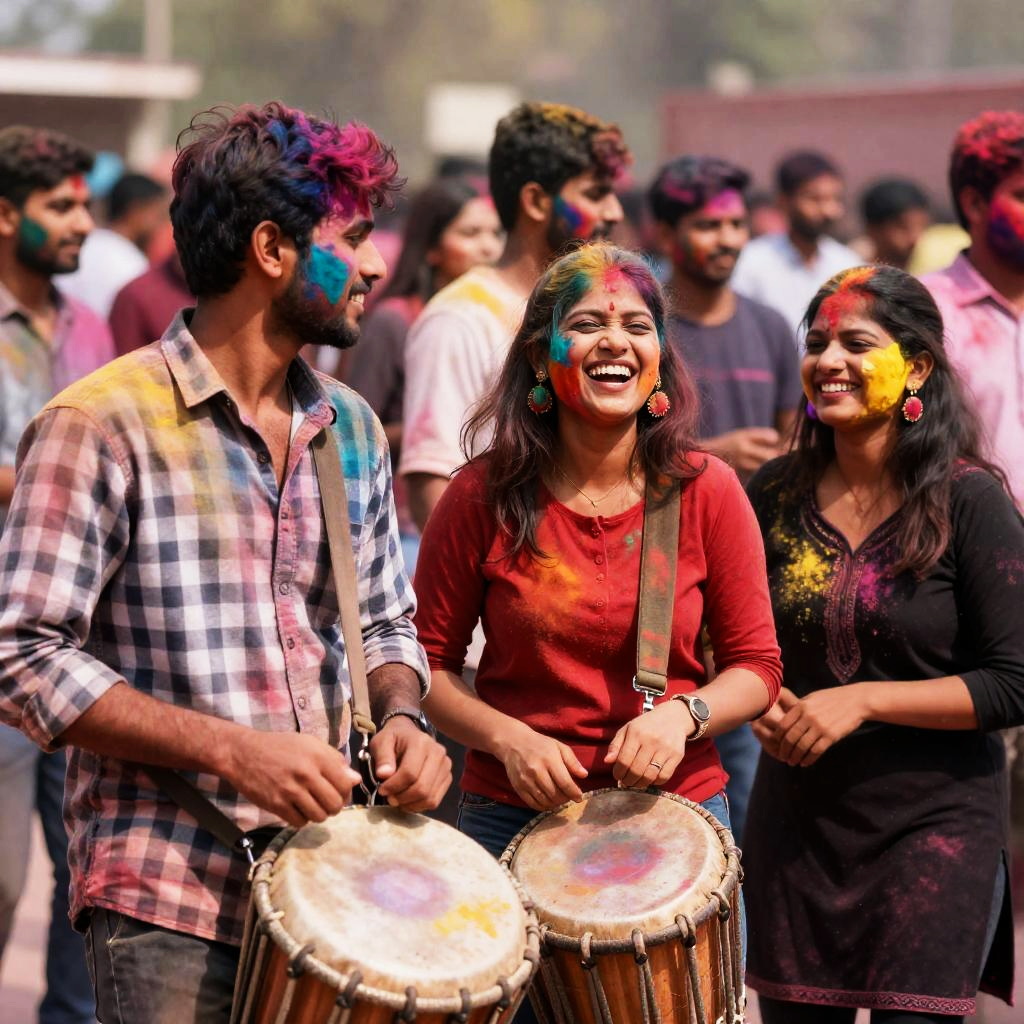 Photograph of a vibrant Holi festival. Three people in the foreground: man in plaid shirt playing drum, woman in red shirt laughing, woman in black dress smiling. Background filled with people, colorful powders covering everyone. Bright, joyful atmosphere.