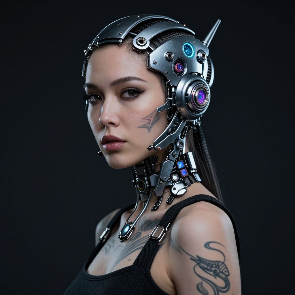 Photograph of a cyberpunk woman with metallic headgear, black tank top, tattoos, and glowing blue and purple accents against a dark background.