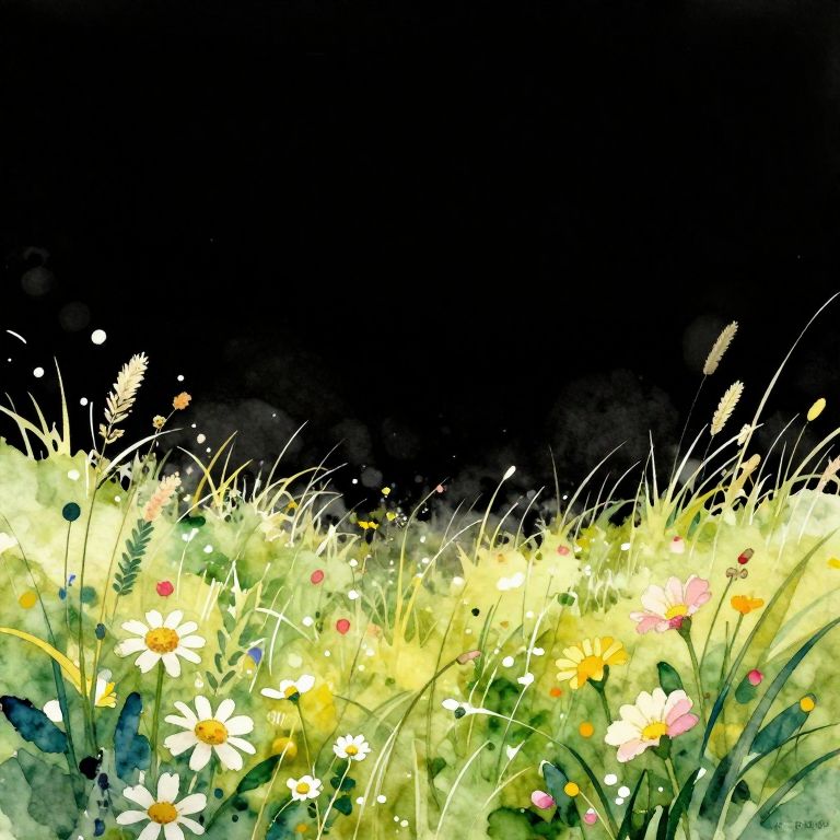 This digital watercolor painting depicts a vibrant field of flowers at dusk. The foreground is filled with a variety of flowers, including white daisies, yellow dandelions, and pink and orange blossoms, all surrounded by tall, green grass and wispy, white wildflowers. The colors are bright and lively, with a glowing effect that contrasts against the dark, nearly black background. The light source seems to come from the bottom, illuminating the flowers and creating a soft, ethereal glow. The texture of the watercolor medium is evident, with gentle, flowing brushstrokes that add a sense of movement and tranquility to the scene.