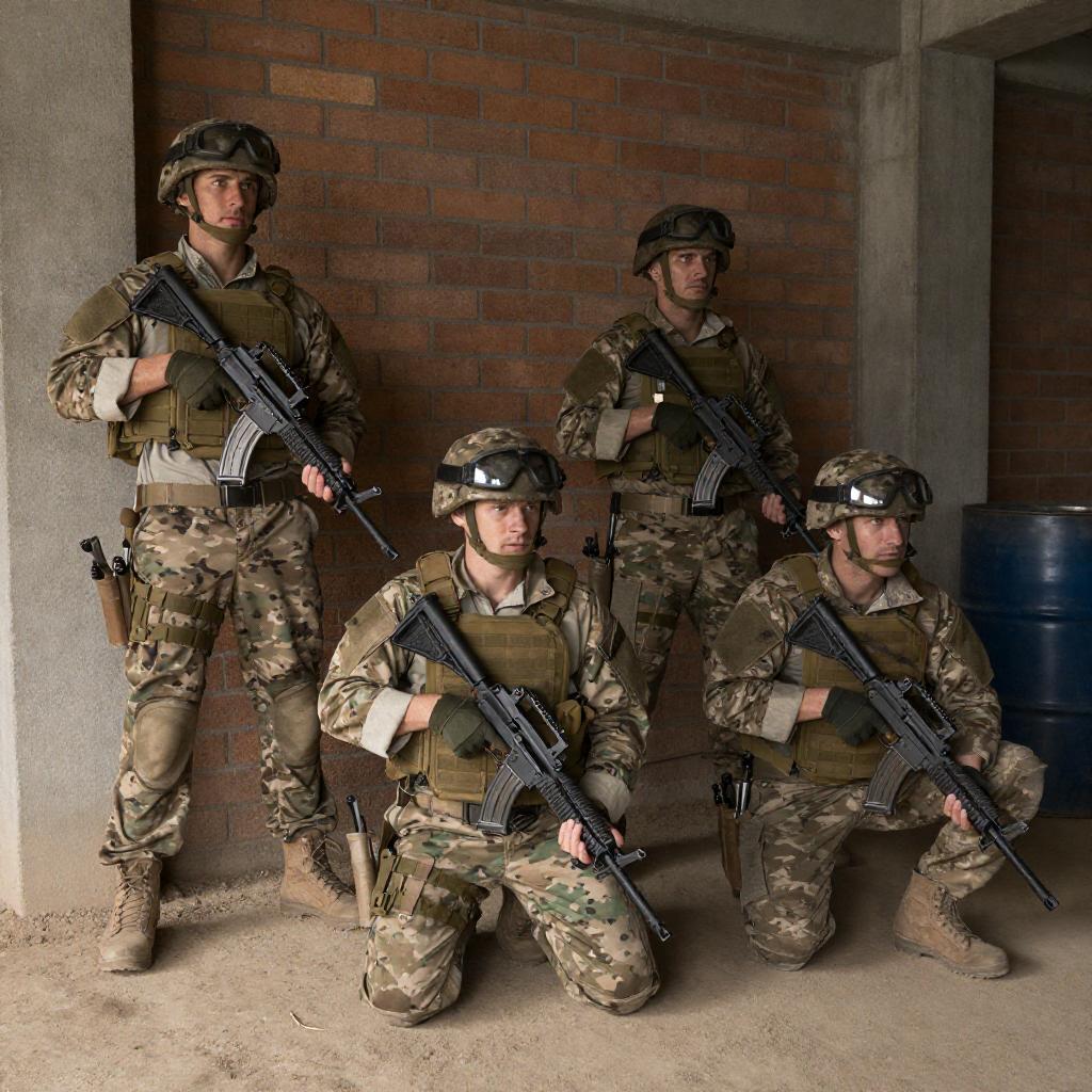 Photograph of four soldiers in a dim, dusty room. They crouch against a brick wall, holding rifles. Each wears camouflage gear, helmets with goggles, and tactical vests. The soldier on the far left is standing, while the others are crouched. Concrete pillars and barrels are in the background. The soldiers' expressions are focused and intense.