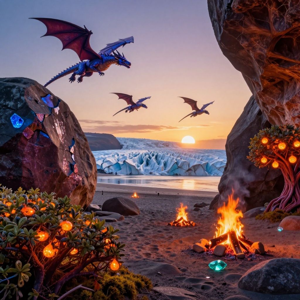 A mesmerizing sunrise, glacier, beach, flying dragons, chipped boulder, electrified bushes, cave, bush, moss, lit by natural glow, torches, bonfires, glowing magical emeralds, glowing fruit on magical trees, moonlighteverything looks perfect, good vibes, positivity, most beautiful picture in the world, <8k, high detail, uhd, sharp focus, palette, photorealistic, absurdres, extreme detail, as much detail as possible, extremely high visibility>, shiny indigo, shiny orange, bright beige, dark yellow, matte maroon, matte blue