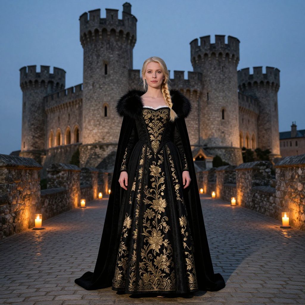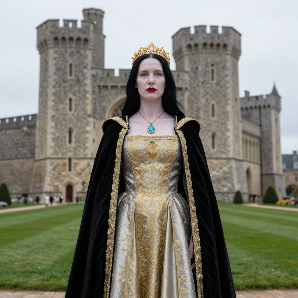 Photograph of a pale-skinned woman with long black hair, wearing a gold crown, red lipstick, and a regal gold and silver dress with intricate patterns. She's draped in a black velvet cloak with gold trim and a blue pendant necklace. She stands in front of a large, stone medieval castle with tall towers and a green lawn. The sky is overcast.