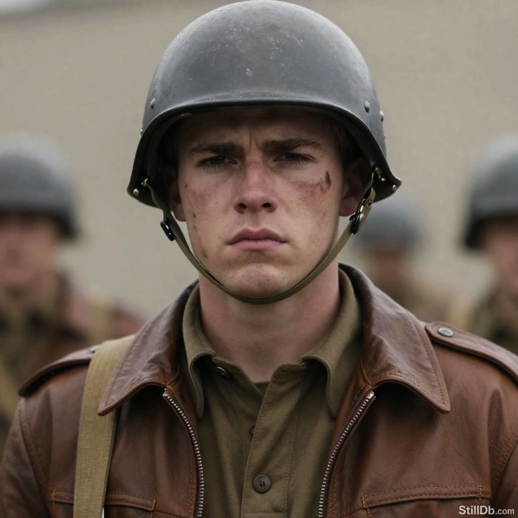 Photograph of a young white male soldier with light brown hair, wearing a metal helmet and brown leather jacket. He has a serious expression, slightly furrowed brows, and a dirt smudge on his left cheek. Background is blurred. Soldier is centered, facing forward. MovieStillDb.com in bottom right corner.