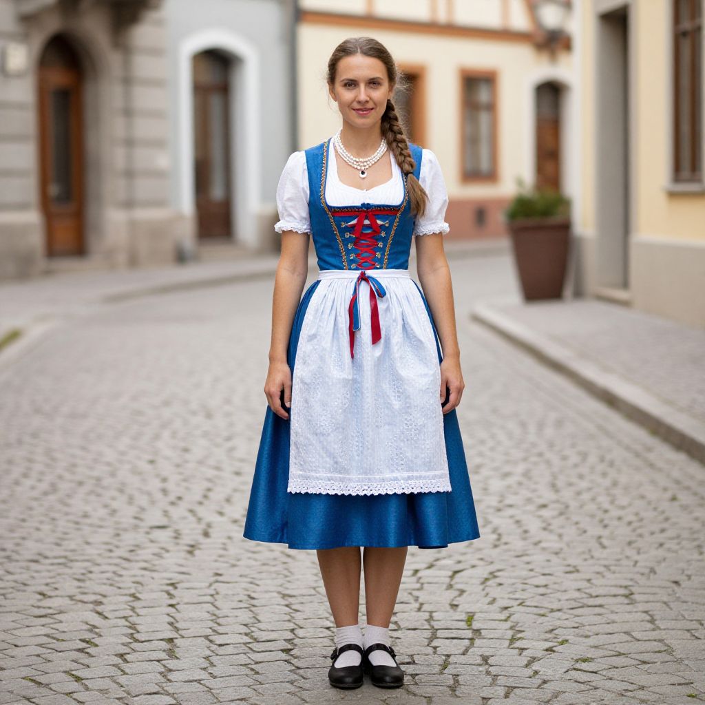 Bavarian dress costume, woman in a blue and white dress standing on a cobblestone street